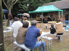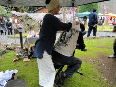 | 演奏終了後のひとコマです。「必ず写真を撮っておいてくれ」とのリクエストで紹介です。LIVEステージの後方に出店の「マッサージ屋さん」です。10分間500円?だったかな?・・・Tさんは、演奏後直行。はじめから‘20分’と言ってチェアーに座ってはりました。 | ||||