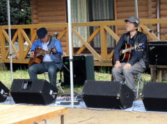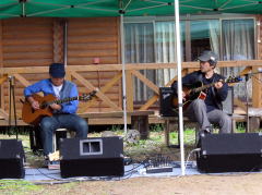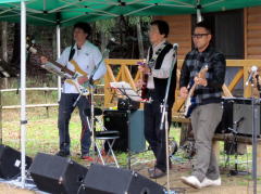 オープニングは3ピースによる‘ベンチャーズ’。そして、グループサウンズやフォークソングを披露くださいました。ベースのTさん。曲が進むにつれ「お蕎麦を頂ける時間が刻一刻と迫ってまいりました」・・・と主催者への気遣いも手抜かりありません。 そんなこんなでオープニングを飾るベル・ウッドの演奏も、アンコール曲‘ブルーシャトー’にて終了となりました。 |