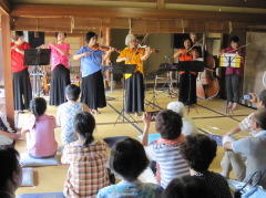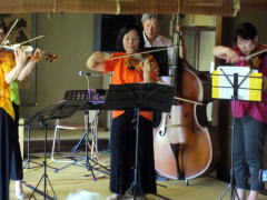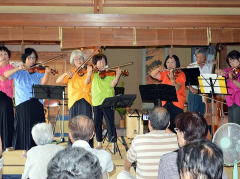 | バイオリン・フルートのアンサンブル、コントラバスも加わって・・・シンデレラのみなさん。みなさん最近に楽器演奏を始められたらしく、演奏のたびに技術もステージ度胸も向上!といったところです、とのことでした。そうそう、ステージ衣装もすべてお手製だそうです。 オープニング曲は‘竹田の子守歌’です。つづいて、映画音楽‘エデンの東’〜サウンドオブミュージックの‘エーデル・ワイス’。ゆったりとした演奏に心も穏やかになりました。「これからますます上達して、またどこかでお目にかかりましょう・・・」とのこと。次回も楽しみにしています^^v。 |