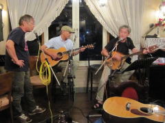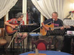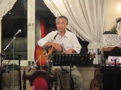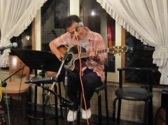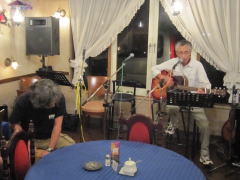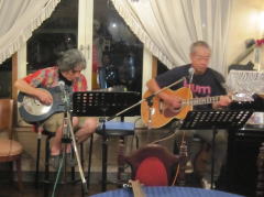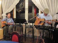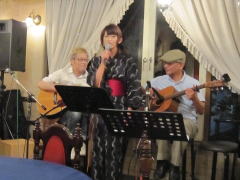 まず1曲目は、ブズーキーとギター、そしてTさんのコーラスも加わって‘風に吹かれて’byボブ・ディラン(左)。バンマスさんが訳詞した歌詞に乗せて反戦メッセージを・・・。 つづく2曲目も「今日は8月8日、明日9日は長崎に原爆が落とされた日なもんで・・・」とシリアスな‘広島を語る’を(右)。・・・急造バンドとは思えないくらい三人の息もぴったりでした! |