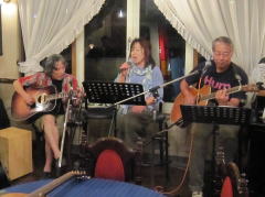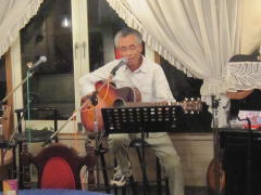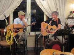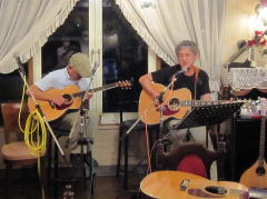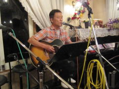 まず1曲目は、Tさんのオリジナル‘175R(イナゴ・ロード)’。かつて月一LIVEを行っていた「小野市マカール」に出演の際、「店に来るまでの気持ちを唄った歌です・・・」と、ご披露されたのをよく覚えています。(左) つづいて、飛び道具・・・?みたいな1曲。ビックリするほど、ハードルの高い世良さんの‘鉄爪(ひきがね)’。ボーカルのキーがお二人さんではきびしいようで、バンマス奥様が助っ人です(Yes, I do)。お二人のギターは圧巻でした。興味があれば、一度「you-tube」で検索して見てください。元ロックバンドのボーカルだった世良さん。そんな彼も今やギターリスト・・・というくらいのテクニックです。そのアコギ編、たくさんUPされています。それをそっくり耳コピーして・・・の技には驚かされます。(中) そして、ここでYさんのギターに注目・・・。Nationalのスライドギター登場。とりあえず・・・という感じで、ハワイアンのインストを1曲。「とりあえず・・・」というのは、この後がメイン。「集中練習の成果が一気に開花した」とでも言いましょうか?実にタイムリーでステキでした。au「浦chan」の歌。三線とはまたひと味違うスライドギターによるハワイアンテイストの‘海の声’でした。 |
