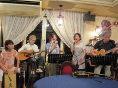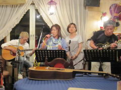 =セット リスト= @ 500miles A Day dream belivers B 島人ぬ宝 C But it's all light encore: THE ROSE 1曲目と2曲目はともに洋楽に、今は亡き忌野清志郎さんが歌詞をのせた名曲です。‘500mailes’は、松たか子さんがお歌いになっておられましたし、‘Day ・・・’は清志郎さん自ら、「タイマーズ」というバンドでお歌いになっておりました。フラットマンドリン(左)やブズーキーを用いて(ともにバンマス)演奏しました。手前味噌ではありますが、ボーカルお二人のコーラスもバッチリ決まっていました。 3曲目と4曲目は、三線、カホン&ベースギター、10ホールズ・ハープも加えて、バンド編成での演奏となりました。そして、会場のみなさんのご厚意に甘えて、アンコール曲まで演奏させていただきました。本当にありがとうございました。とても気持ちよく演奏できました。 まずは。野狐禅さんの‘じゅうじか’を。サビで繰り返される「じゅうじか〜」の歌詞が頭から離れなくなりました^^v。 本人さんは、当初、「1曲で・・・」といってはりましたが、許してもらえるはずなく、即アンコールで‘STAND BY ME’を。そして、地元出身のトータス松本さんの‘バンザイ〜君を好きでよかった’を。 |