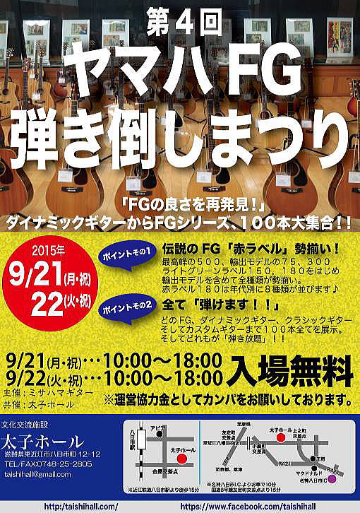 シルバーウィークの2日目、21日(月)に滋賀県で開催されている『第4回 ヤマハFG弾き倒しまつり』に出かけてきました。