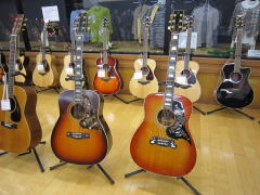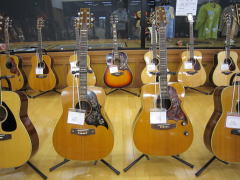 | FG-180をはじめ、様々なFGが所狭しと並んでおりました。どれを弾いてもO.K.。おまけに、弦の張り替えもお願いできる(なんとなんと、ヘビーゲージまで用意されていました)といった「至れり尽くせり」の展示会でした。ハカランダのFG-500?だったかな?・・・「お持ち帰りするならこれだね」・・・は、side-Bの相方、K西君と同じ意見でした^^v。 |