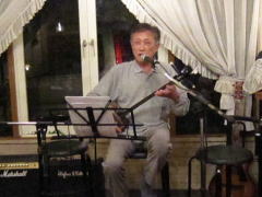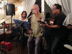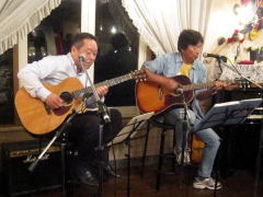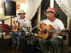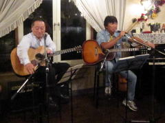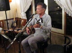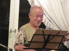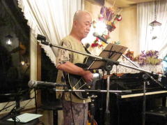 気を取り直して、‘ある木曜日の午後’を。こちらは申し分なく、うっとりと、とってもいい気分にさせていただきました。いやいや、まだまだつづきます。‘天王寺想い出通り’by大塚まさじさん。。歌はもちろんのことながら、いわゆる「泣きのギター」とでもいうのでしょうか?ムードたっぷりのエレキリードがたまりません。 そして、いよいよラストナンバー。「今宵は練習もそこそこなので、定番ばかりで・・・」とOさんでしたが、その定番を別アレンジで^^v。若干ソフト感を出して???。う〜ん、なんと表現してよいのやら???。しゃかりきではなく、おだやかな感じで‘幸せそうな人たち’を。ギターの刻みも歌い回しも、そして、エレキのフレーズも、すべてに「癒し系」を感じました。やっぱ、師匠。さすがの演奏でした。 |