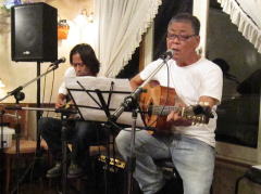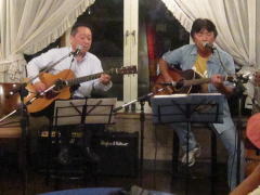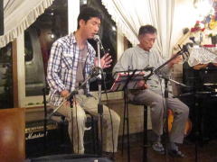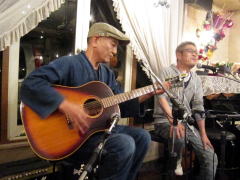 オープニング曲は、Sさんのサポートも得て、十八番の1曲から‘胸が痛い’を。1曲入魂・・・今夜は、これで・・・とTさんでしたが、そんなことが許されるわけもなく、ましてや2か月ぶりなのですから・・・と会場からのアンコール&リクエストで、急きょ、さらなる1曲を・・・となりました。何を演奏するかなぁ・・・と右往左往してるところへ、強力な助っ人さんが登場=Mさん(右)。そして、Tさんの持ち歌でもある‘一本道’by友部 正人さんを熱唱。また、ひと味違う・・・Mさんらしい個性が出た演奏となりました^^v。 |