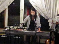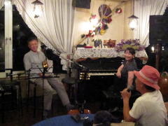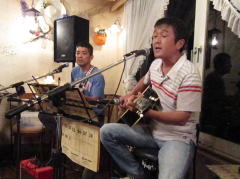 沖縄民謡の歌詞について、少しお話しになり、Oさんとの思いでの曲もある‘昔カイシャ 今カイシャ’を。曲後、「Sさん&レニーさん」のOさんのギター弦ネタにまたまた逆戻りして、三線の弦は・・・ということになりました。三線の弦は絹糸でできているそうで、かなりお高いもののようでした。そんな張り替えたてたての弦の音を楽しむように‘ナリヤマアヤグ’を。ラストナンバーは、ピアノとのコラボレーションで‘三線の花’を。 そして、今宵『判明!』。誰しも触れなかったというか?触れていいのか迷っていたのか?・・・ピアニストさんのお名前が分かっちゃいました。図らずも「Yさん」。前出の妄想女子ミュージシャンYさんと同じだったのです。今後は『W(ダブル)−Y(ワイ)』でLIVEを盛り上げていただけるものと思います。 |