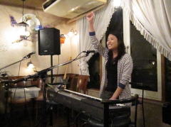 「こんばんは〜」←「Y(名前の連呼)」でステージスタートです。まずは、ごあいさつ代わりに、ピアノインスト。‘砂の器’〜‘AQUA’・・・音楽番組ではお馴染みの「それでは、2曲つづけてどうぞぉ」・・・という展開でした。そして、キーボードの調整中にMC。なんとなんと、このシルバーウィークの期間に新車を購入されたとか^^v。お気に入りの1台が見つかったとのことで、次回のLIVEでは、新車で乗り付けて・・・となりそうですね。本HP公開の頃には納車みたいです。 といったところで、調整も整い‘Star Days’・・・お星様の恋愛ストーリーです。アップテンポな曲につづいては、しっとりバラード‘想(そう)’・・・学生時代、4年の月日を費やし完成した曲だそうです。 ここで、またまた雰囲気をがらっと変えて、‘STDR’・・・生活の中のいろいろな場面で自分を着替える・・・そんな歌、(S=そ)(T=と)(D=づ)(R=ら)です。そして、そしてラストソングは、会場参加型の歌。ある意味、みなさんお待ちかねの‘クラップ’。年齢や酔い具合を判定するにはもってこい?いやいや失言でした。とっても楽しい曲なので、みなさんも、ぜひ、会場で『手拍子に挑戦!』してほしいですね。 |