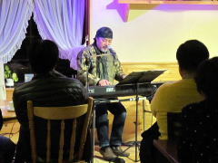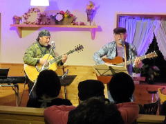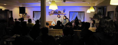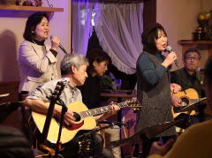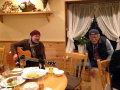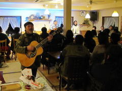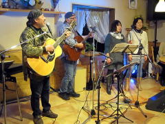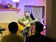 | まずは、キーボードの弾き語りでLIVEスタート。そして、ギターの弾き語り。途中、友情出演となった、LIVE主催者のTさんとセッションも。メッセージ満載のステキなオリジナルソングに楽しいMC。コミカルな替え歌も・・・。 |