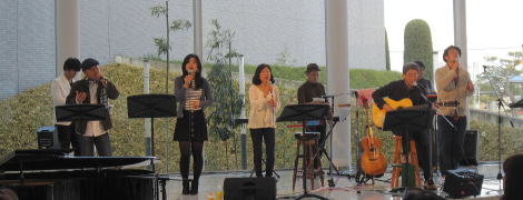 | 5人のボーカリストそれぞれの力強い歌声と、コーラスのすばらしさに酔いしれる・・・そんなLIVEでした。リストにもありますが、昨年末の「小河邸の約束」でも披露された曲を再び・・・。三木市でのLIVEには出向けなかったわたくしにとっては、とてもうれしいことでした。 |