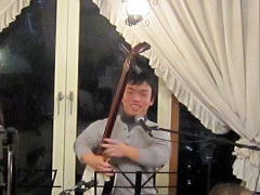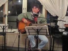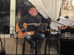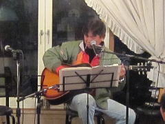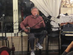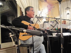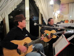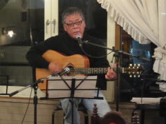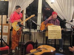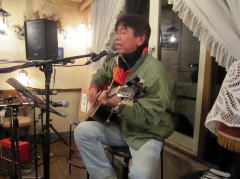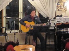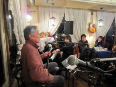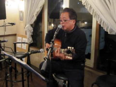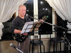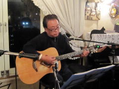 つづいてもう1曲。これは、今や十八番中の十八番・・・‘胸が痛い’by憂歌団。師匠のギターを心地よさそうに弾きながら、ムードたっぷりのボーカルで、いかしてました。 つづいて、‘ムーンリバー’〜‘月の沙漠’をメドレーで。う〜ん^^v渋い!でした。Oさん、ギターコードがかっこいいんです。いわゆる「ONコード」や「♭ファイブ」や「♭ナイン」のコードを駆使して・・・の演奏でした。そして、‘冬の星座’。小学校で唄われる唱歌として著名ですが、実は洋楽なんですね。 ラストナンバーは、一転ベタベタブルース調で‘横浜ホンキートンク・ブルース’を。これは、めちゃかっこよかったです。 |