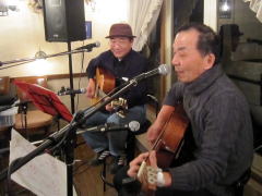 まずは、加川 良さんの‘教訓T’^^v。つづく2曲目も、加川 良さんのナンバー。‘赤土の下で’。当時の社会への反骨心とでもいいますか?世間や政治に思い切りメッセージを・・・そんな楽曲です。とても考えさせられる1曲でもありました。このお二人だけでなく、ここぶどうの木LIVEでは「加川 良フリークの方々」もけっこういらっしゃいます。日本のフォークソングの草分け的存在のシンガーなのです。中津川フォークジャンボリー・・・これまた伝説のイベントで、今もその時代を謳歌された方々が全国各地で「○○○ファークジャンボリー」なるイベントを開催されていますね。 ラストナンバーは、もうお馴染み。みなさんお待ちかねの‘プカプカ’byデュランU。「やっぱり二人揃っての演奏はええやん」・・・でした。今宵は、リードギターもバッチリ決まって、言うことなしでした^^v。やっぱり、ユニットは楽しいですね。 |