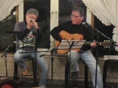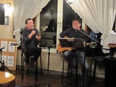 Sunrise’と‘Take It Easy’をチョイス。にわか練習でチャレンジとなりました。当夜のLIVEでは、これまた、side-Bのお仲間に無理言って(左)、EAGLESつながりで‘Desperado’も。さらにさらに、当夜はじめてぶどうの木へ遊びに来てくれた、カホンT君(中)にもお手伝いいただきました。 そして、Sさんの〆は、ホストMCのMさんとのコラボ(右)で‘SAN FRANCISCO(花のサンフランシスコ)’by Scott McKenzieを。実はこの曲、9日のヒットパレードの打ち上げ会で二人の演奏を聴かせていただき、リクエストしていたのです。 |