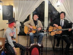 | 当夜は、数ヶ月前にオーディエンスとしてお見えになった若者衆^^v(今宵はいよいよLIVEデビュー:バンド名は「ホワイト・ストーンズ」 となりました:下段画像:カーデガン&スーツのお二人)、そして、LIVE-HOUSE等で演奏活動をされている「カホン」君(ハットをかっこよく決めています)と、新しいお仲間さんも加わり、即興演奏もまじえて、大いに盛り上がりました。 | ||||||||