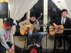 ・・・「ホワイト・ストーンズ」のお二人〜、そして、カホン担当のT君です」・・・ホストMC、Mさんの軽快な紹介を受けて、3人さんのステージがスタートしました。ギターのお二人とカホンの彼とは、今宵初対面でした。ふだん、ギターのお二人は、エクレアズ?という音楽好きのサークル?を楽しんでいらっしゃるようです。また、カホンのT君は、神戸のLIVE-HOUSE等で活躍されてるようです。 まずは、緊張をほぐすのに・・・「実はトークが得意というか?好きというか?(左ホワイトさん)」と、会場のみさんとのしばしのトーク。会場からの質問に次々と屈託なく答えて・・・。そのうち、そうした流れの中で、バンド名も決められてしまったという訳です^^v。命名は、音響担当でもありましたSさん。はたして、このユニット名での今後のLIVEのご予定はいかに?。 ということで、今宵のデビューLIVE、渾身の演奏曲は、‘虹’byELLEGARDEN。ギターリフもいかしてたし、ボーカルもとてもいい声で・・・。「今の若い子はすごいなぁ・・・ぱっと出て、演ってまうねんからなぁ・・・」と、おじさん達は感心しきりでした。 |