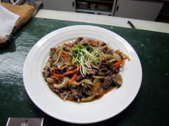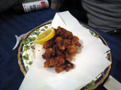 | 今宵のおいしいお食事紹介・・・。当夜はお酒もけっこう進んで盛り上がりました。・・・てなことで、酒の肴にもなり得る?メニューをピックアップです(飛び入りトリの若者たちも舌鼓を打っておりました^^v)。できあがるたび、ホール係のYさんが「できましたよ〜、お写真は?」と声をかけてくださいました。 左から「グリルチキンのチーズ焼き」「タコの唐揚げ」「焼き肉」の3品です。見てるだけでもヨダレが・・・^^;。一度に・・・とはいきませんので、毎回ちがったメニューで楽しんでみるのが最高かと^^v。 |