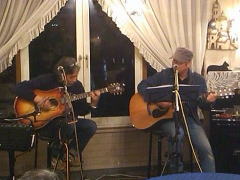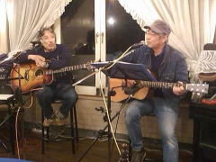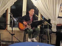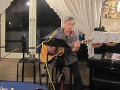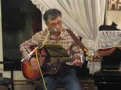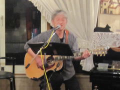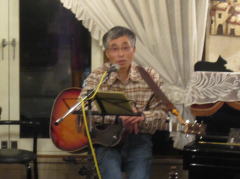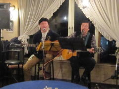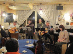 飛び道具ネタはともかく、演奏は、もちろんいうまでもなくGood!。まずは、サイモン&ガーファンクルさんの‘コンドルは飛んでいく’を。つづくは、AKB48の、まさしく旬の歌‘365日の紙飛行機’を。Tさん(左位置)の指の骨折も完治され、今宵はようやくギターも聴かせていただけました。 ここで、Tさんは、ガットギターをベースギターに持ち替えて・・・「実はこのベース、形はノーマルなんですが、世界にひとつしかないのです。こうなります」と点灯。会場からは拍手喝采・・・とあいなりました。そして、わたくし‘や’もお仲間に加えていただき、グレン・フライさんをしのんで、EAGLESのナンバー、‘Tequila Sun Raise’〜‘Take It Easy’そしてそして、ラストナンバーは、やっぱり外せない‘サボテンの花’byチューリップ。これを持ってとどこおりなく・・・お開き〜。 |