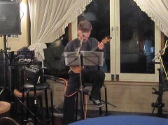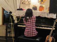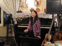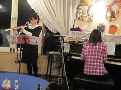 まず、1曲目は‘Star Days’。生ピアノの効果でしょうか、低音がドスンと来て、気持ちよかったです。つづいて、‘STDR(ソトヅラ)’。いささかサスペンス的な歌だと思うのですが・・・^^;、ベース・ランのフレーズがとてもかっこいいのです。Yさんの演奏のラストはPIANOインストゥルメンタルで‘AQUA(アクア)’。水の一生?をイメージされた曲です。ここまで、すべてオリジナル曲。その才能には、ほれぼれしてしまいます。そうそう、後ろ姿もステキでした^^v。 ここで、Yさんのご友人、フルート奏者のJちゃん。音大出身の、いわゆる本チャンのお姉さんです。お二人でのコラボ演奏は、NHKみんなの歌より‘月のワルツ’by諫山 実生さんを。歌中のフルートのオブリガードは、いかしてました。ぜひまたの機会に、今度はインストも聴かせていただけたらうれしいです。 |