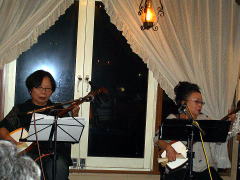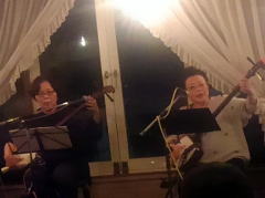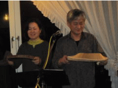 まずは、‘花嫁人形’〜‘伊勢音頭’。伊勢音頭は、純民謡とでも言いましょうか?三味線の音の並びや引っ張り、それにからむ歌唱がとても心地よく、上等なお座敷に呼んでいただいて、杯を手に(そうそう肘置きみたいなものもとありましたね)・・・というような心地になりました。また、「はっ」や「よぉお」の間の手も、とてもかっこいいのです。 ラストナンバーは、まさに日本の歌‘さくらさくら’。ぜひぜひ、これを機会に、たびたび演奏にお越しいただければ幸いです。よろしくお願いします。 |