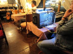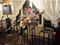 つづいて、ガットギターに持ち替えて‘春よ来い’by高橋ただしさん。そして、ラストナンバーは、パソコンによるバッキング音に合わせて、三線の弾き語りで‘海の声’by浦ちゃんを。う〜ん・・・、いよいよぶどうの木LIVEもICT突入です。 |