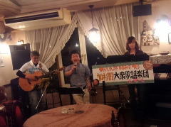 キーボードとギターのバッキングで、お届けいたしましたのは、‘高原列車は行く(岡本 敦郎さん)’〜‘東京ラプソディ(藤山 一郎さん)’〜‘丘を越えて(藤山 一郎さん)’。そして、ありがたくも、ENCOREをいただき、‘憧れのハワイ航路(岡 晴夫さん)’を。 翌日の「蕎麦街道LIVE」に向けての最高のウォーミングアップにもなりました。今後も少しずつレパートリーを増やしていけたらと思っています。 |