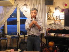 | 今宵も横月さんの名口調でLIVEスタートです。今宵は驚くほどたくさんのお客様がお見えくださり、LIVEスペースはぎっしり満員。みなさん、緊張の中にも、演奏にMCに力が入りました。マスターも大忙しで。今夜は海老とコロッケが大人気! | |||||||||||||||||||||||||||||
