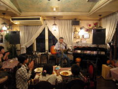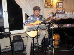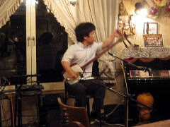 | まずは、シタール風な音色が出るようにと、ブリッジ周辺を自らカスタマイズされた(さすが、ギタークラフトマンYさんです)ギターで。 1曲目は、i-padを用いた「打ち込みバッキング演奏」に合わせて・・・オリジナルのギターインスト。つづく2曲目もシンセチックな音色で、これまたオリジナルインスト‘拉麺・餃子・天津飯’を。タイトルからもはかれますが、まさにチャイニーズテイストあふれる曲でした。 |