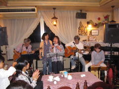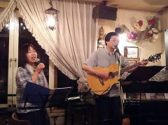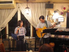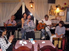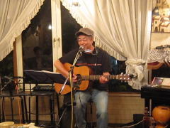 | ラストナンバーは、Tさんの十八番、テーマソングである‘何もなかった日に’を。今宵は一人で弾き語り・・・とのことでしたが、会場から、ワイヤレスマイクをとおして、Kさんのコーラス、そしてYさんのリードギターが聞こえてきました^^。 | |||||||||||||||||||||||||||||