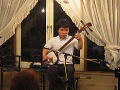| 調子を合わせつつ、指ならし・・・で、演奏へなだれ込み・・・からの‘即興曲’を。みなさん、目が覚めて、キリッとしたところで‘津軽じょんから節’を。右手のバチさばきもさることながら、左手というか左手指の、ギターでいう「ハンマリング・オン」&「プリング・オフ」が、それはそれは見事です。 | |||||||||||||||||||||||||||||