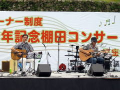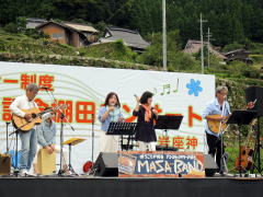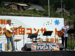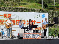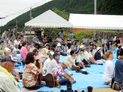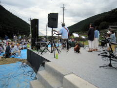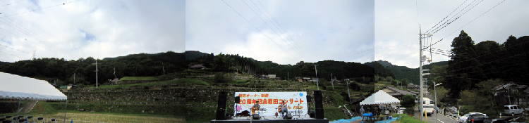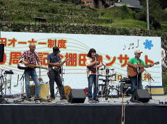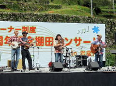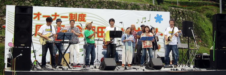 | ご覧ととおり、バリバリのブルーグラスミュージックバンドです。ギターやバンジョー、マンドリン、オートハープなどなど、楽器の音色もさまざまに、軽快な演奏を楽しませてくださいました。 | この棚田コンサートでは、語らずには終われない坂庭省吾さんの名曲を披露くださいました。 | ||||