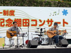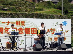 | 去る9月25日(日)、 バンマスさんの地元、多可町加美区岩座神(いさりがみ)にて、およそ10年ぶりとなる『棚田コンサート』が開催されました。 ここ岩座神では、20年前、「全国の棚田を守ろうサミット」に参加したことを受け、『棚田オーナー制度』をスタートさせました。いわゆる都会の方々から棚田のオーナーを募り、岩座神にみなさんがお世話された「お米」を食べていただこうというものです。年間数回、オーナーの方々には棚田にお越しいただきイベントに参加いただきます。後に岩座神棚田が「日本の棚田百選」に選ばれたことを機会に、この地の美景を後世に伝えようとする取組のひとつとして、この棚田コンサートもスタートしました。そして、プロミュージシャン(故 坂庭省吾さん)を審査員として迎え、アマチュア音楽コンテストとしてつづけられていました。現在注目される「地域創世」「農村地活性化事業」の草分け的事業です。 |