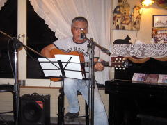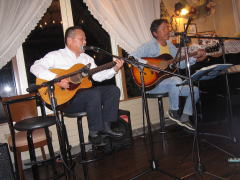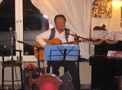 | さて、いよいよ〆に入りました。スーパーギタリストのバレーさんをむかえて(右画像)、‘六本木ララバイ’by内藤やす子さんを。師匠の渋いボーカル、そして、バレーさんのツルッツルのリードギター(観客のTさん談)、最高でした。でもでも・・・じぃじ、♪ぞうさんを唄うのを忘れておられたようで・・・ | |||||||||||||||||