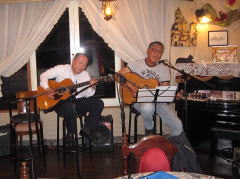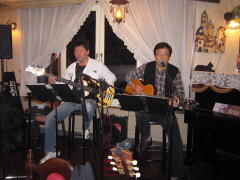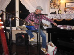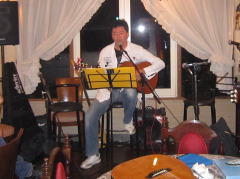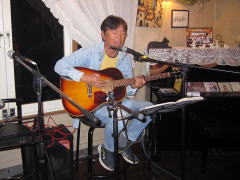 | ここで、ぼちぼちいこかのギタリストMさんが登場(右画像)。ギター:チェリーさん、ボーカル:Mさんで、拓郎さんソング、‘どうしてこんなに悲しいんだろう’を。Gibson J-45のストロークがめちゃくちゃ心地よかったです。Mさんとチェリーさんのツインボーカルもいかしてました。そして、とりあえず、チェリーさんのステージは後ほどあらためて・・・ということで、弾き語りコーナーは、‘祭りのあと’で〆。 | |||||||||||||||||