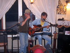 | つづいては、チェリバレさんの十八番‘飯でも喰いに行かへんか’by歌屋BOOTEEさんを・・・。「今宵は、LIVEに来てもらったHさんのためだけに歌います」とのチェリーさんのMCに、会場のお仲間さんたちは、待っていたかのように「帰れ〜もぅ・・・」コール。これもお約束でしたね^^。 そして、こてこてブルース・・・宇崎竜童さんの‘ベースキャンプ・ブルース’を。そして、MCはさまず、怒濤の‘たくあん’by憂歌団さん。 |