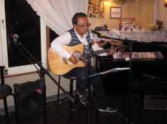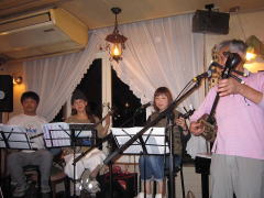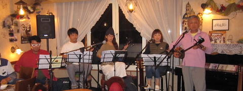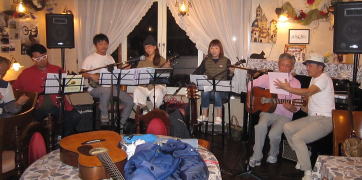 | ここで、再度チューニングを変えて、‘三線の花’を。ふだんはK師匠おひとりでの演奏ですが、今宵は、ピアノバッキングと三線5本。音の厚みがちがいますね。弾き語りとはまたちがった趣で楽しませていただきました。今後もどんどんレパートリーを増やして、ぶどうの木LIVEへ来てください。 | |||||||||||||||||