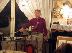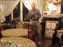 | ホストMC、Eさん、恒例のご発声で、「ぶどうの木LIVE 11月第2土曜会」のスタートです(左画)。今宵もたくさんのみなさんにお集まりいただきました。 | ||