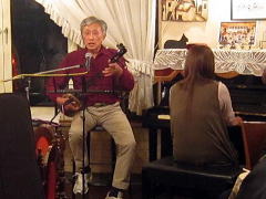 | お題がおさまったところで、つづいてはブルースを。宇崎竜童さんの‘横浜ホンキートンク・ブルース’。Tさんの張りあるハイトーンに驚かされました。歌い込んではるなぁ・・・いうとこです。そして、もう一曲。きくち寛さんの‘ホンキートンク・ピアノ’を。すっかり十八番の逸曲なので、余裕たっぷり、ムードたっぷりでした。 | ||