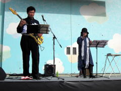 まずは、こちらも今月のお題にちなんで・・・。リードギター担当のムーンYさんが、白い「ミニ・ボンゴ」?でサポート。アイボリーTさんのボーカルで‘インスタントラーメン’by古井戸さんを。 |