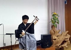 「津軽三味線」では‘じょんから節’や‘即興曲’の演奏を。また、師匠の流暢なMCは会場の笑いを誘いました。