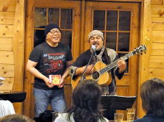 | そして、(右画)は、ホストTさんとメイン・アクターのさかもとさんです。来る1月には、西脇市のCafe&Restaurant「Orange」さんにてLIVEを開催されます。わがマサバンドも前座演奏させていただきます。お楽しみに! |