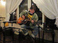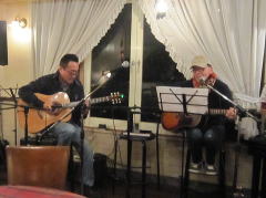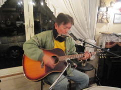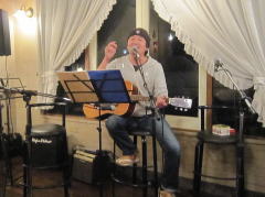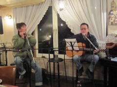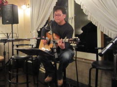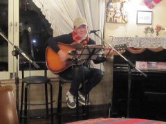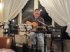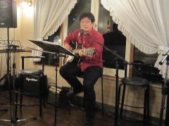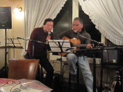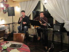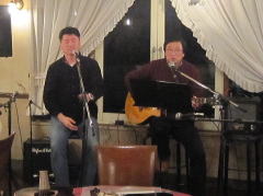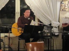 | 今宵は、当初、Sさん(左画)、Tさん(中画左)、各々のステージで・・・の予定だったようですが、Sさんの「やっぱり、一人やとさみしいから、手伝ってよ」・・・ということで、Tさんがコーラスでサポート。ハーモニーよろしく、‘クリスマス・イブ’by山下 達郎さん〜‘Day Dream Believer’byモンキーズさんを。さすがでした。 | ||