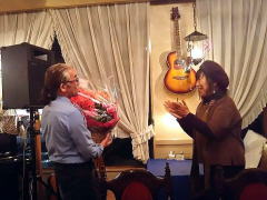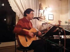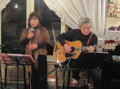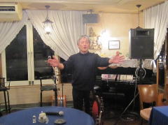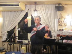 | つづいては、22年前の震災の時に横月さんが作詞され、「星の歌コンサート」にて、みごと入選を果たされた‘愛・この星に生まれて’を。そして、今宵は、出演者も少ないようなのでじっくりと・・・のMCにつづいてもう1曲、「鳥」にちなんで、‘Fly Me To The Moon’を。英語歌詞の歌もバッチリで、かっこよかったです。 1954年の作品。ジャズのスタンダードとして知られた曲だったようですが、かのフランク・シナトラさんが歌われて、大ヒットとなったそうです。 |