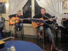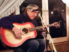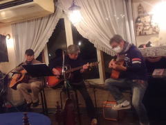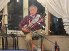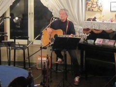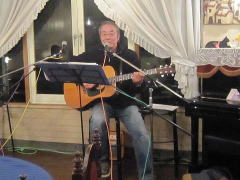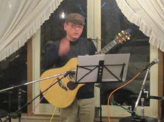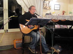 | まずは、相方さん抜き、久々の弾き語り(左・中画)で‘自転車に乗って’・・・高田 渡さんのナンバーが有名ですが、今回の曲は、西岡恭蔵さんのナンバーです。お聞きするに、西岡さんが高田さんの曲に触発される流れでできた曲なのだそうです。わたくしもはじめて聴かせていただきましたが、イントロのスリーフィンガーがとてもかっこよかったです。 | |||||||||||||||||||||||