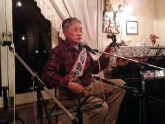 | 横月さんが、ここぶどうの木LIVEに参加されるようになられた当初に演奏された逸曲。新年1月のお題「酉」にちなんで、‘ニワトリさんの唄’(オリジナル)を。ニワトリさんは本当に重宝だそうで、虫や草、ほんとに何でもよく食べてくれる。そして、栄養たっぷりの卵をたくさん産んでくれる・・・と横月さん。古くより、農家の家畜として、大切の飼われていたことからも、「ニワトリさんの命によって、我々人間に命が保たれてきたのだ」ということがよく分かります。 | |||||||||||||||||||||||