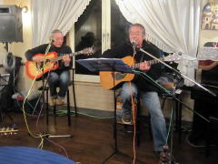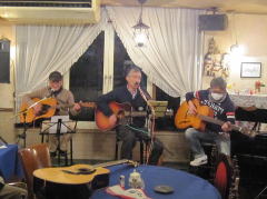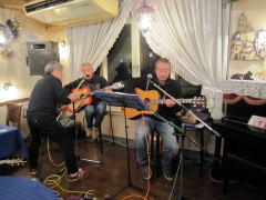 | 助さん役のK君はギター(左)、格さん役の‘や’はベースギター(右)。そして、メインボーカルの横月さん(中)が黄門様・・・ということで、お贈りするのは、‘冬の稲妻’byアリスさんです。歌唱後は、お約束の「サン・キュー(K君)」・・・「ありが・とぉう(横月さん)」もバッチリ決めて、拍手喝采・・・。ありがとうございました。 | |||||||||||||||||||||||