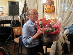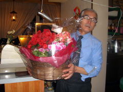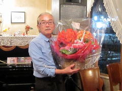 | 出演者みんなから、お祝いと感謝のお花。お花好きのマスターへと、切り花でなく「鉢植え」を。これからしばらくは、このお花も楽しみに来店です。 | |||||||||||||||||||||||