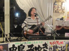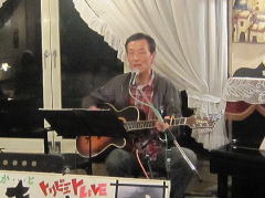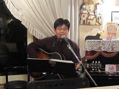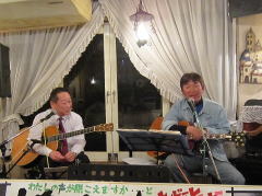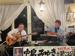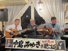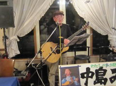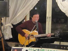 | つづいては、今夜のお題?、中島さんにちなんだ楽曲を・・・ということで、Tさんのお好きな吉田拓郎さんとのコラボレーションで、かの嬬恋2006のサプライズステージとなった‘永遠の嘘をついてくれ’を。そして、ラストナンバーは、先ほどの楽曲につながって、吉田拓郎さんの‘流星’を。 拓郎さん、剛さん、千春さん・・・と、まさしく70〜80年代のフォーク&フォークロックの道をミュージシャンとともに歩んでこられたTさんです。 |