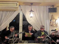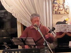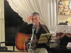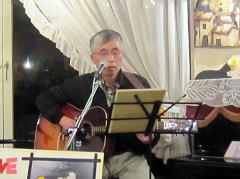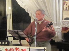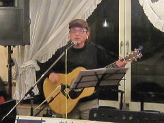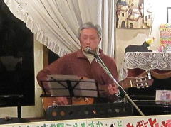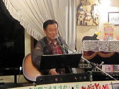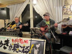 | お三人での演奏で、ナレーションで大いに盛り上がったところで、アイボリーさんお二人のステージへ。先月末の第4土曜会でもお披露目があったのですが、第2土曜会では初お披露目。クラフトマンさんの新作ギター(中画)、『ドラゴンギター』です。前回の画像よりは幾分ボディーの彫刻が明瞭かな?とも思いますが・・・。興味ある方は実物を見に来てください。 ということで、新作ギターのバッキングもよろしく、ボーカルのアイボTさんがかねてから唄いたかったとの‘ウィスキーの小瓶’byみなみ らんぼうさんを(右画)。 |