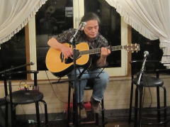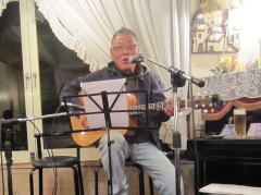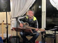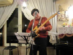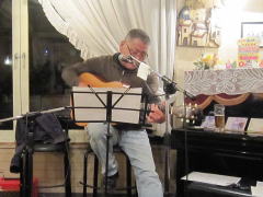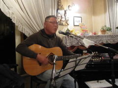 | まずは、モアリズムさんの‘笑う花’を。長らくお聞きしていなかったレパートリーでした。かつてのマカールLIVEでは、十八番曲だったようにも記憶していますが^^v。つづいては、加川 良さんの‘東京’を。ブルースフレーズのイントロがかっこいいとことでしたが、リードギターのMさんが、今宵は珍しく早くからほろ酔い気分で・・・Take2とあいなりました。まぁまぁ、ご愛敬^^v。 | ||