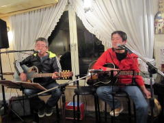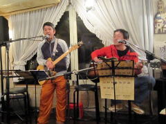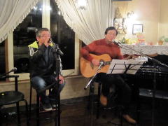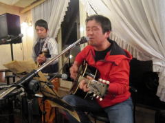 | 歌い切った後、Sさんを迎え入れ(右画)、お二人でラストソング。‘ZOO(愛をください)’by ECHOSを。ハモがバッチリと、とてもかっこよく決まりました。これにて終了・・・と思いきや、会場から早くもENCORE。。。「もう一曲やれやぁ〜」に応えて、‘風を感じて’by浜田 省吾さんを。 | ||